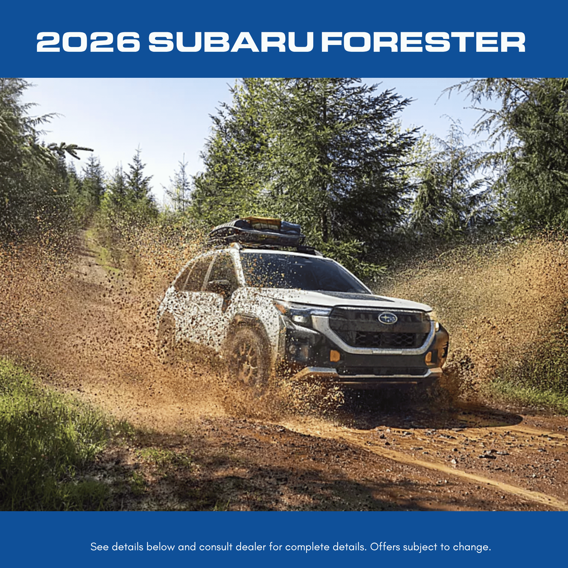 2026 Subaru Forester Base Model (Stock - 261160, Model Code TFB 01) Finance Offer 0.9% APR financing up to 36 months. $22.80 per month per $1,000 financed. Lease Offer $199/month for 36 months with $3,999 due at signing, plus tax, title, license. 7,500 miles/year. Plus a $395 Dealer Fee.All offers to approved credit per lender. Inventory available at time of posting. While supplies last. All Offers Expire 4/30/26