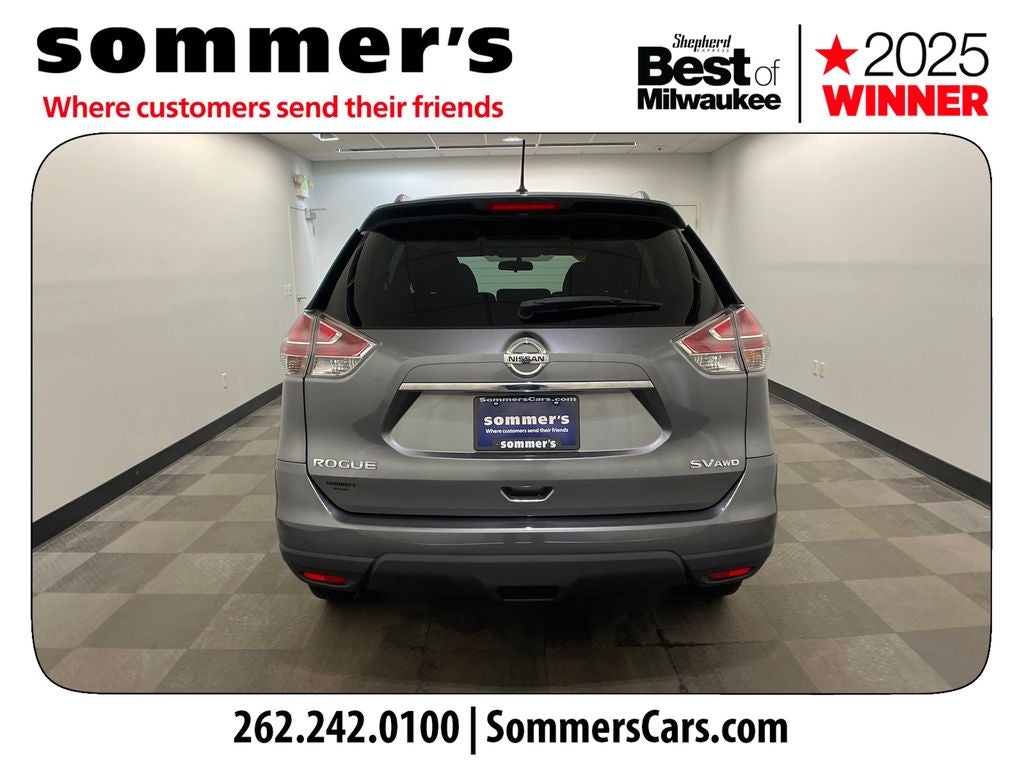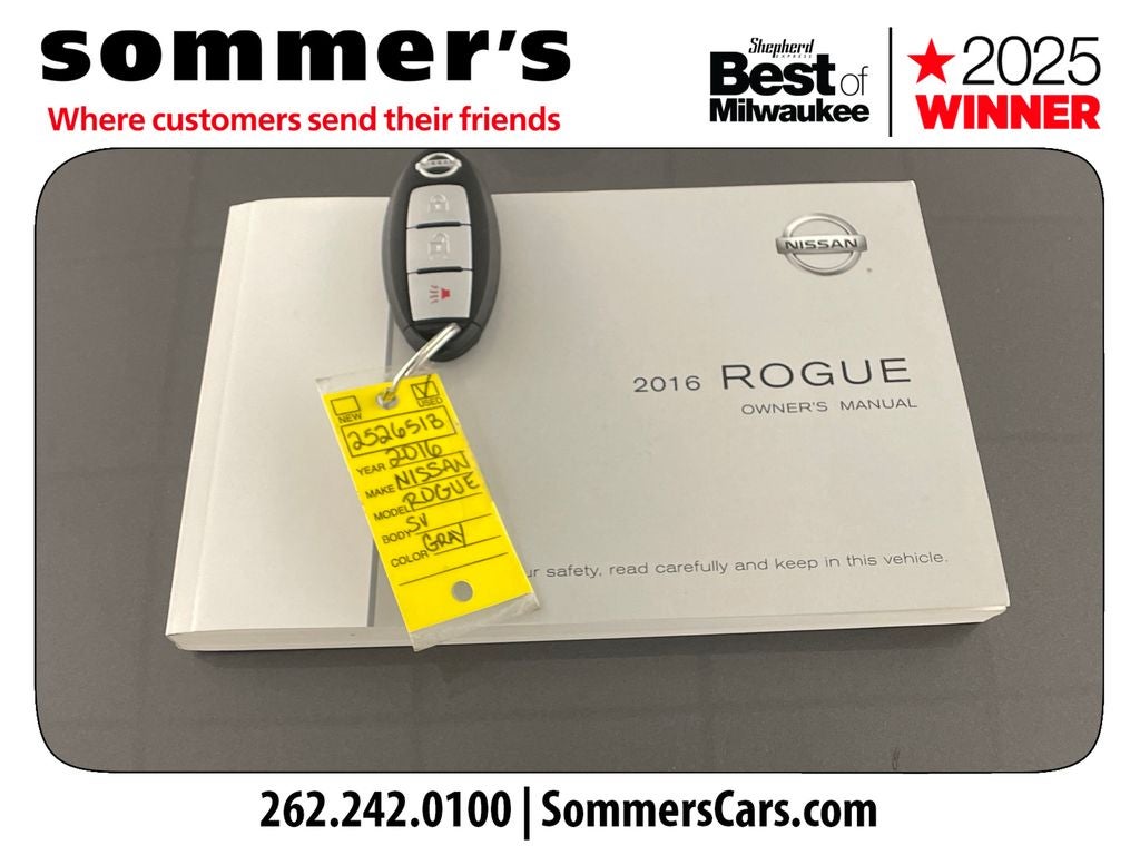 Find this 2016 Nissan Rogue SV AWD at Sommer's Automotive in Mequon, just north of Milwaukee serving Wisconsin drivers in Cedarburg, Grafton, Port Washington, Shorewood, Whitefish Bay, Fox Point, Bayside, Glendale, Wauwatosa, Brookfield, West Bend, Menomonee Falls, Germantown, Sussex, Hartford, Oconomowoc, Pewaukee, New Berlin, Franklin, Oak Creek, Racine, Kenosha, Muskego, Mukwonago, Hales Corners, Cudahy, South Milwaukee, and many more communities throughout the greater Milwaukee, Ozaukee County, Washington County, Waukesha County, and southeastern Wisconsin area.