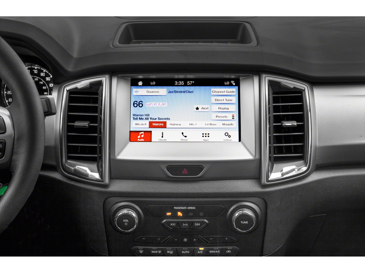 Medium Stone premium cloth seats, tilt/telescoping wheel, locking glove box, and rear under-seat storage add everyday utility.