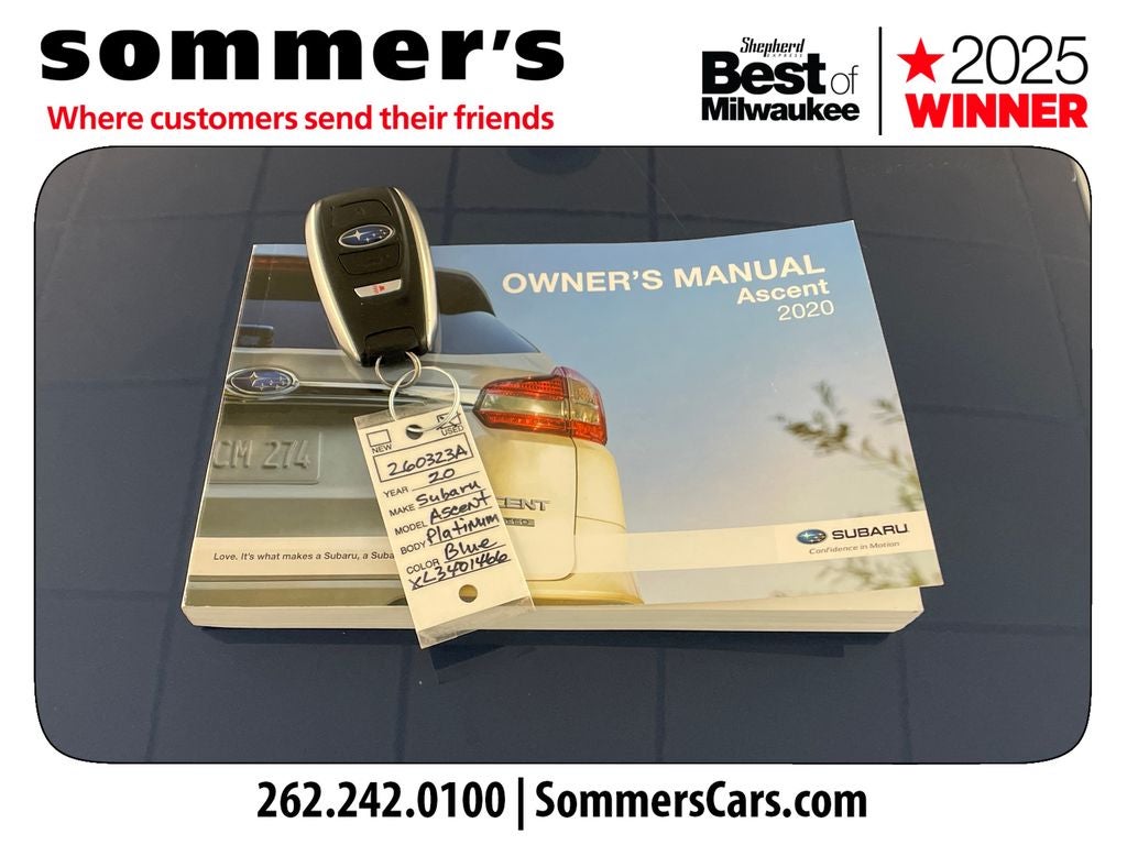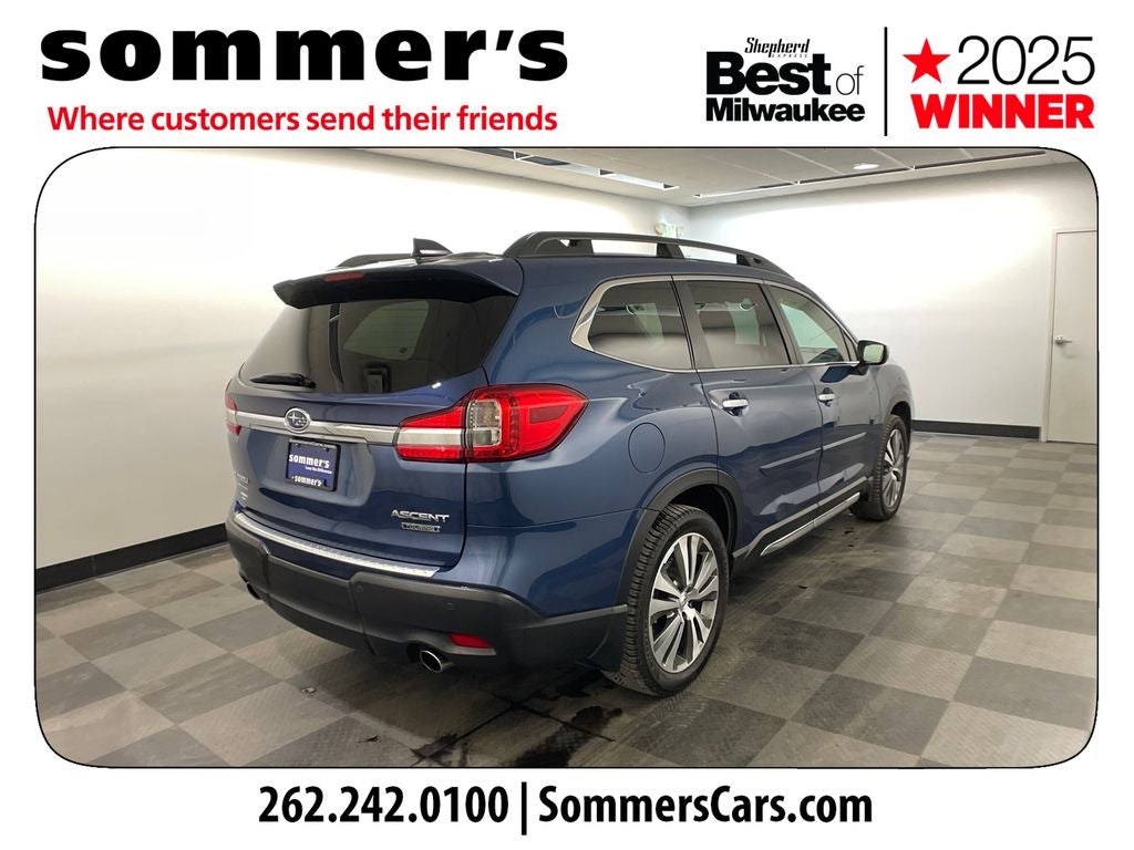 Find this 2020 Subaru Ascent Touring 7-Passenger at Sommer's Automotive in Mequon, just north of Milwaukee serving Wisconsin drivers from Cedarburg, Grafton, Port Washington, Shorewood, Whitefish Bay, Fox Point, Bayside, Glendale, Wauwatosa, Brookfield, West Bend, Menomonee Falls, Germantown, Sussex, Hartford, Oconomowoc, Pewaukee, New Berlin, Franklin, Oak Creek, Racine, Kenosha, Muskego, Mukwonago, Hales Corners, Cudahy, South Milwaukee, and many more communities throughout the greater Milwaukee, Ozaukee County, Washington County, Waukesha County, and southeastern Wisconsin area.