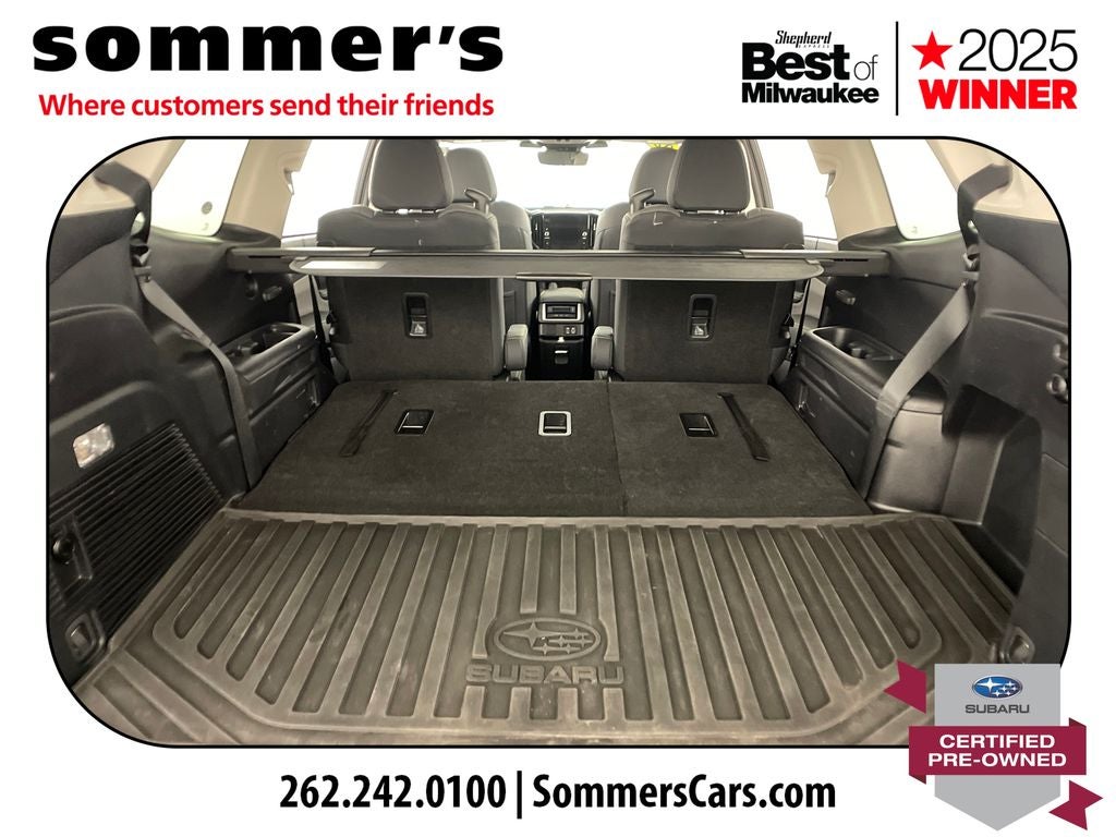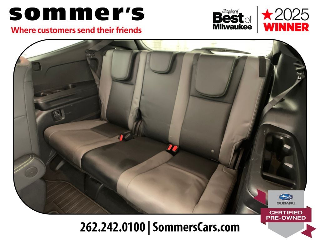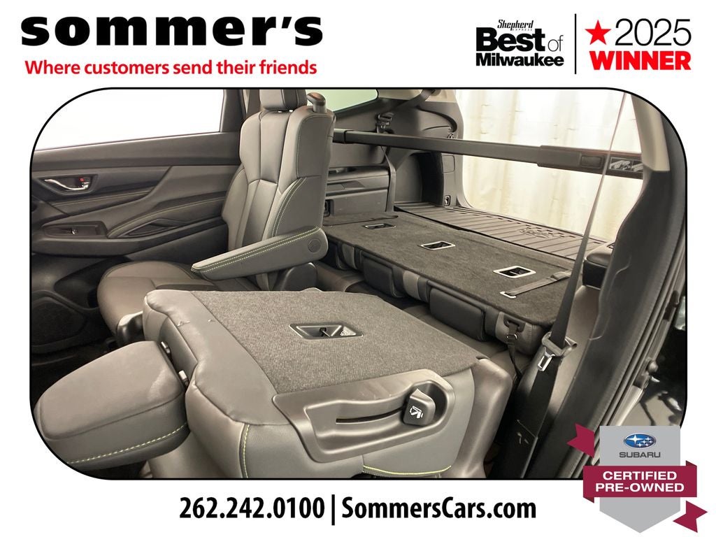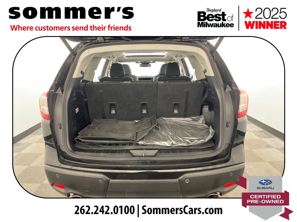 AWD | 2.4L turbo H-4 | CVT | 19/25 MPG | Panoramic sun/moonroof | Heated front seats & heated steering wheel | Power driver seat | 3rd-row w/captains chairs | Apple CarPlay/Android Auto | Wi-Fi hotspot | Power liftgate | Keyless entry & push-button start | Blind Spot Monitor | Adaptive Cruise Control | Lane Keep Assist & Front Collision Mitigation | Back-up camera | LED headlights w/auto high beams & fog lamps | Tow hitch | Aluminum wheels | Privacy glass