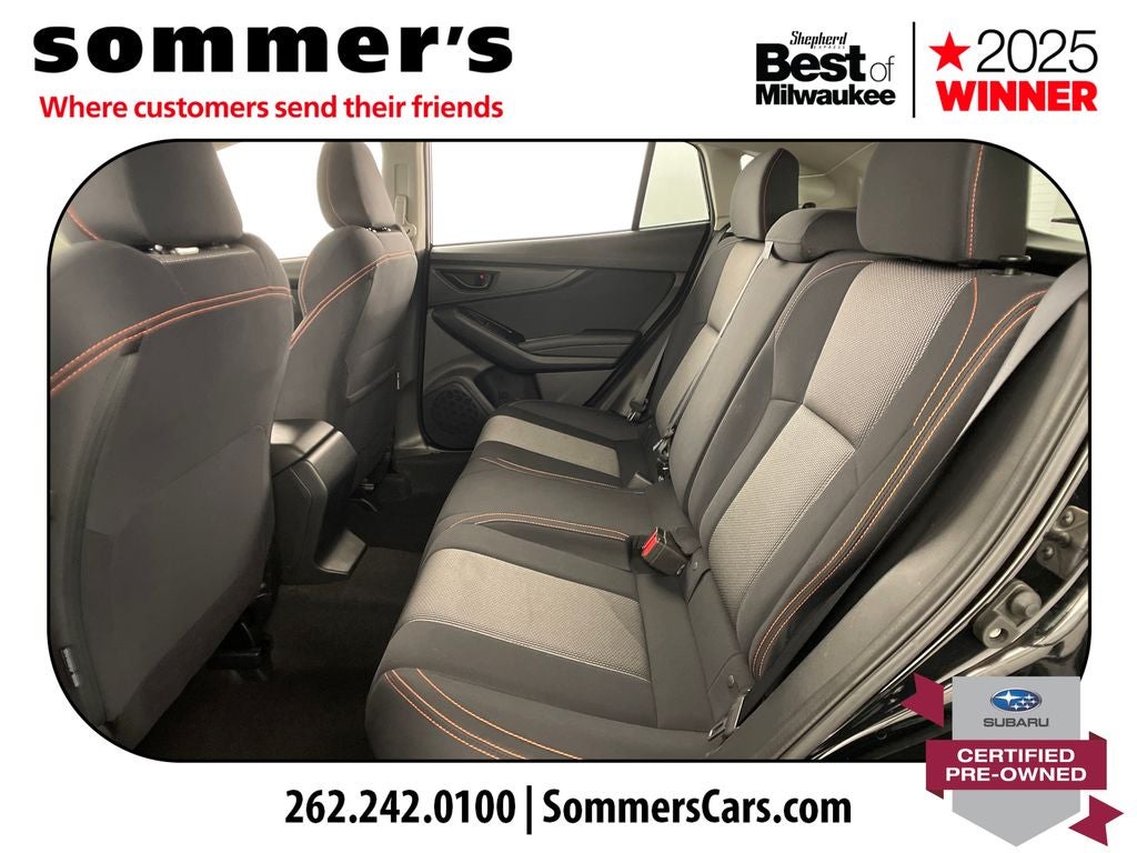 Crystal Black Silica paint, aluminum wheels, fog lamps, heated mirrors, privacy glass, and a rear spoiler give this Crosstrek a sharp look. Inside, black cloth seats with orange stitching, a leather steering wheel, and a cargo shade finish the cabin well.