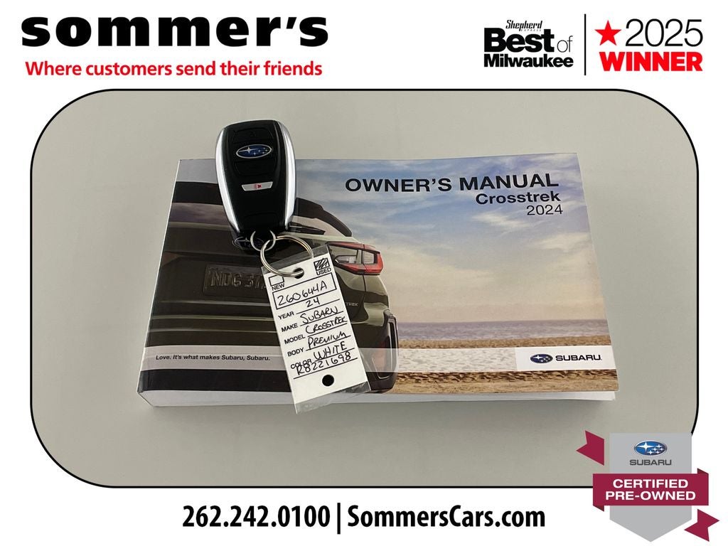 Find this 2024 Subaru Crosstrek Premium at Sommer's Automotive in Mequon, just north of Milwaukee serving Wisconsin drivers in Cedarburg, Grafton, Port Washington, Shorewood, Whitefish Bay, Fox Point, Bayside, Glendale, Wauwatosa, Brookfield, West Bend, Menomonee Falls, Germantown, Sussex, Hartford, Oconomowoc, Pewaukee, New Berlin, Franklin, Oak Creek, Racine, Kenosha, Muskego, Mukwonago, Hales Corners, Cudahy, South Milwaukee, and many more communities throughout the greater Milwaukee, Ozaukee County, Washington County, Waukesha County, and southeastern Wisconsin area.