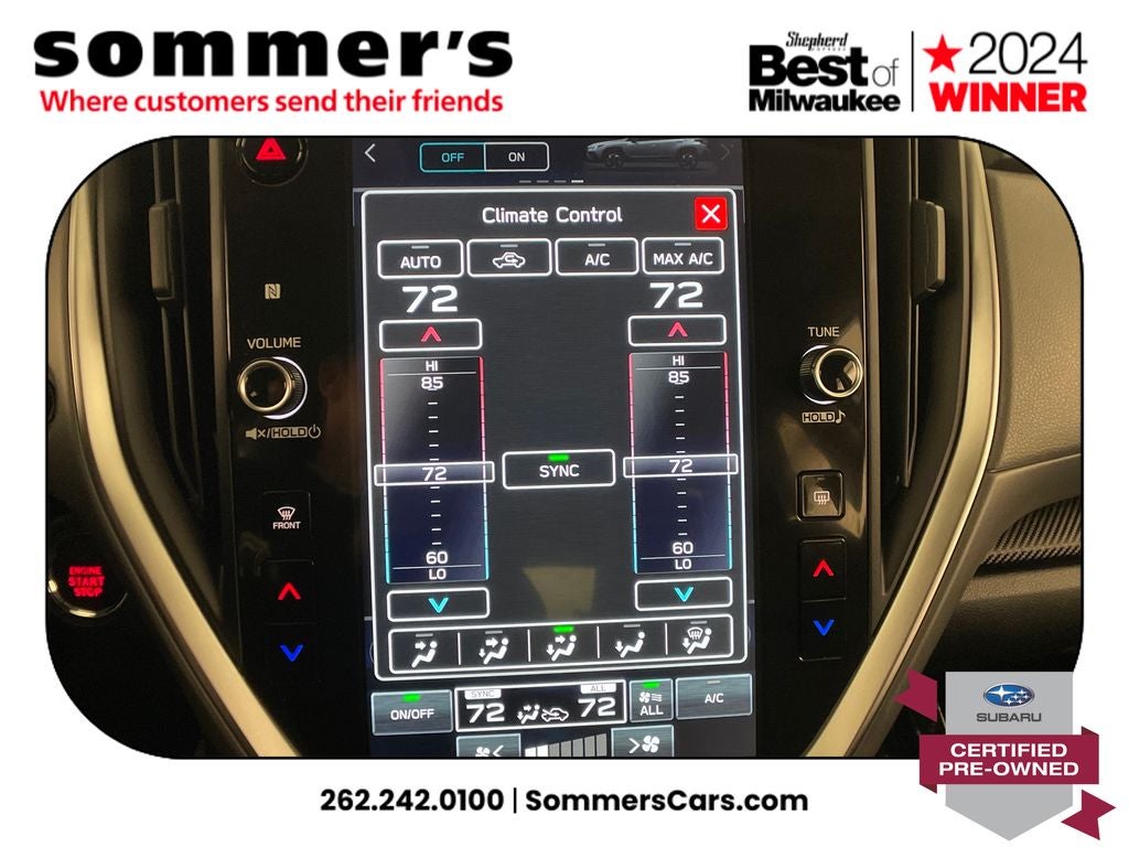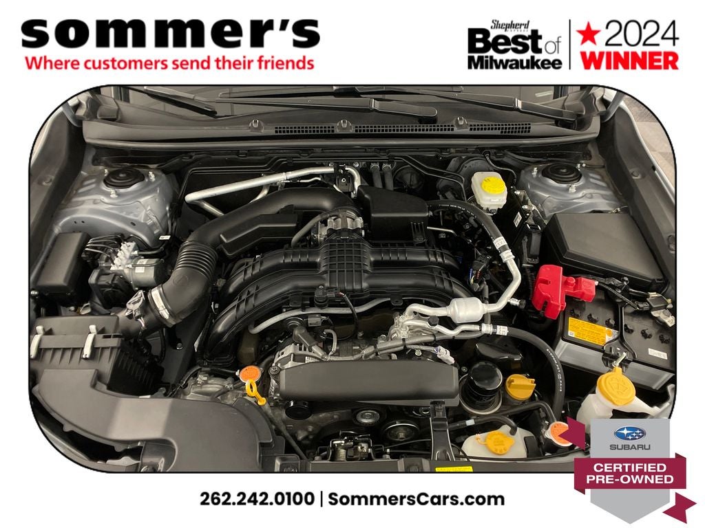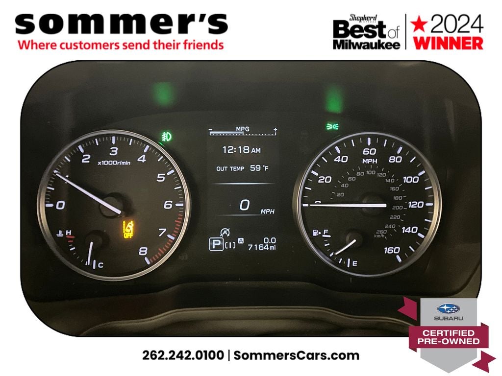 AWD | 2.0L H-4 w/CVT | EyeSight adaptive cruise control w/lane centering & lane keep | Heated front seat | Apple CarPlay & Android Auto | Back-up camera | Auto-dimming mirror w/Universal Garage Door Opener | LED headlights w/auto high beams & DRL | Wi-Fi hotspot & Bluetooth® | Keyless start & keyless entry | Aluminum wheels | Fog lamps | Privacy glass | Rear spoiler | Ice Silver Metallic exterior | Trip computer | Telematics | 27/34 City/Highway MPG