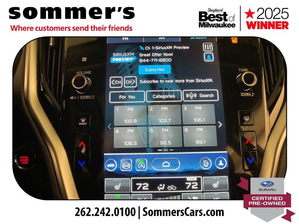 - Radio: Subaru STARLINK 11.6" Multimedia Plus Sys -inc: AM/FM stereo, HD Radio, valet mode, multi-touch gesture high resolution display screen, voice activated controls, Bluetooth® audio streaming and hands-free phone connectivity w/SMS text messaging (refer to subaru.com for cell phone compatibility), Near Field Communication (NFC), iPod control capability, SiriusXM 360L Platinum trial (4 months free trial/subscription required after), SiriusXM Travel Link (4 months free trial/subscription required after), smartphone integration: Android Auto and Apple CarPlay w/full screen view and wireless connection and STARLINK cloud applications (refer to subaru.com for app availability), USB and Over The Air (OTA) audio system update, audio system and Bluetooth® steering wheel control switches, 576 watt harman/kardon surround sound system w/12 speakers, illuminated 3.5mm auxiliary input jack and illuminated USB-A and USB-C input/charge ports SiriusXM Platinum trial available after launch, possibly October 2023.